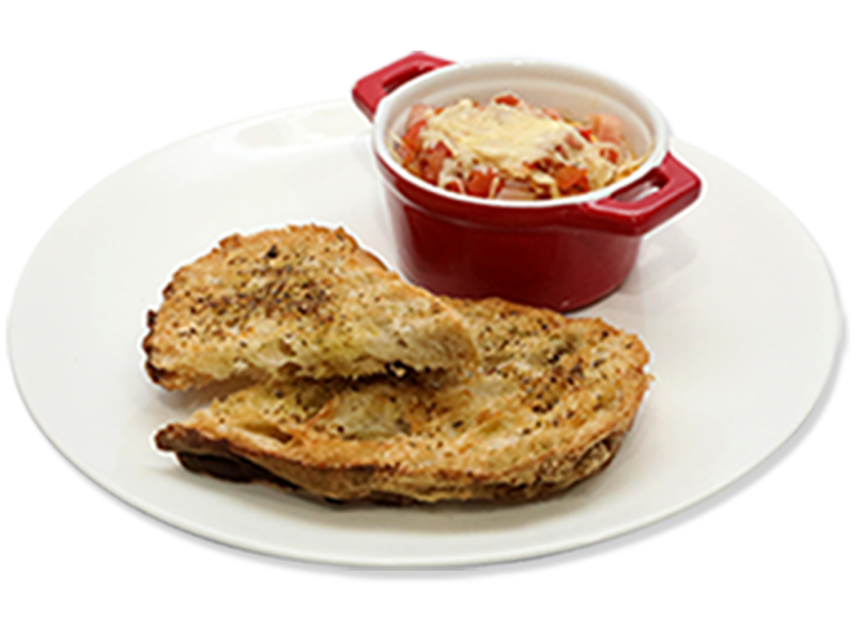 Dos huevos revueltos, jamón, queso mozzarella, queso parmesano, salsa pomodoro, acompañados de sourdough y capuccino. / Two scrambled eggs, ham, mozzarella cheese, parmesan cheese, pomodoro sauce with sourdough and cappuccino.