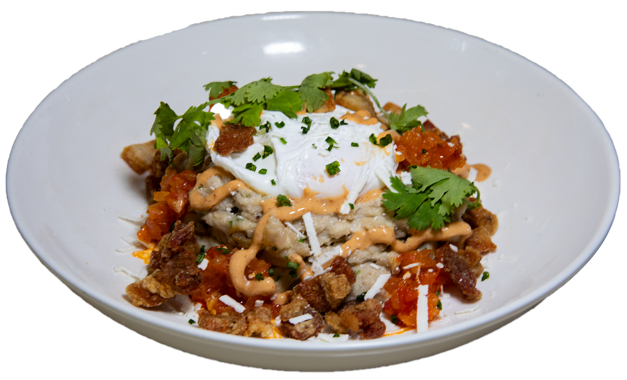 Un huevo pochado sobre cayeye con notas de queso azul y queso criollo, salsa criolla, suero costeño picante, chicharrón, cebollín chino y cilantro / One poached egg, smashed green banana, with blue cheese, creole cheese, spicy sour cream, fried pork bell