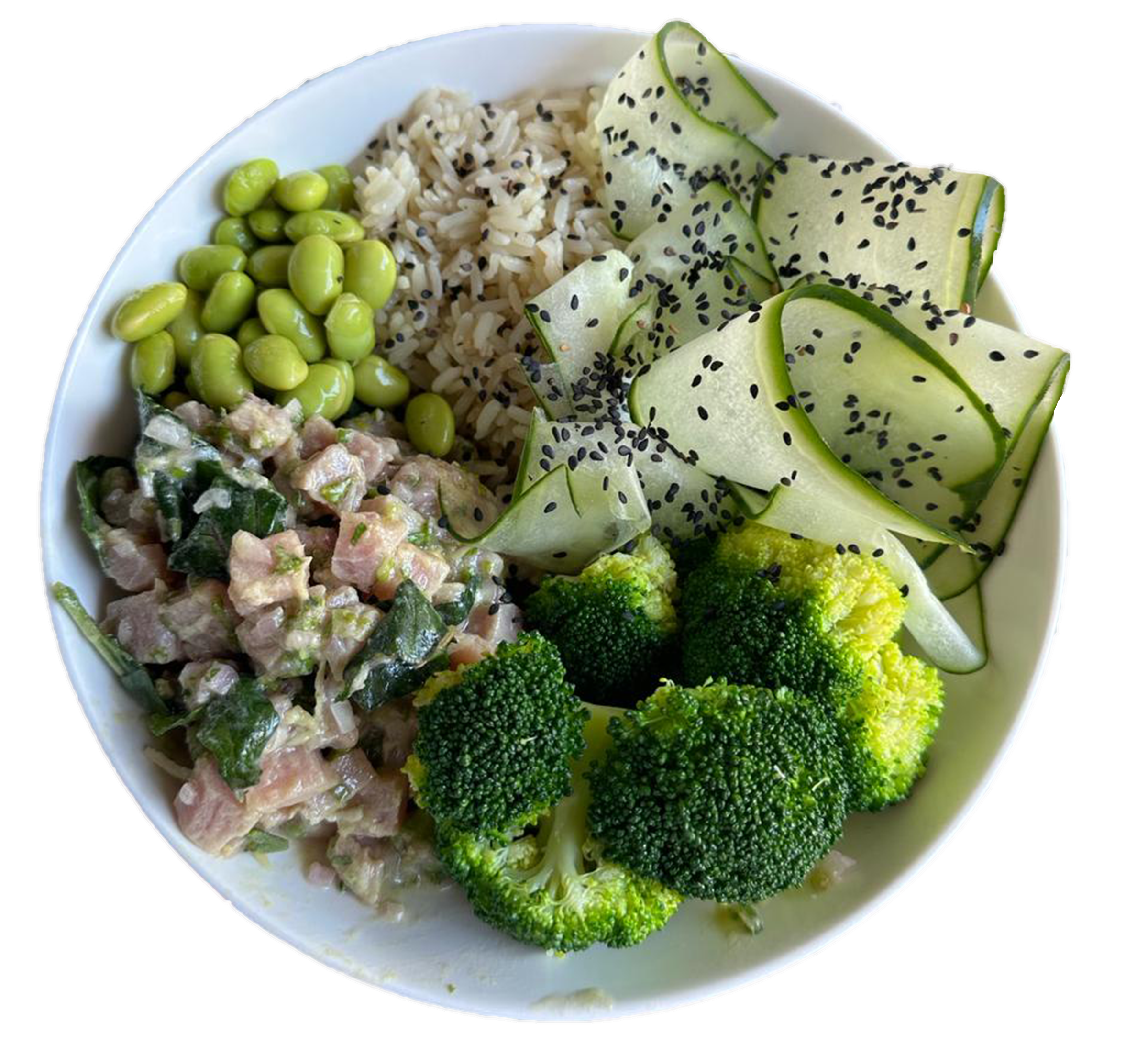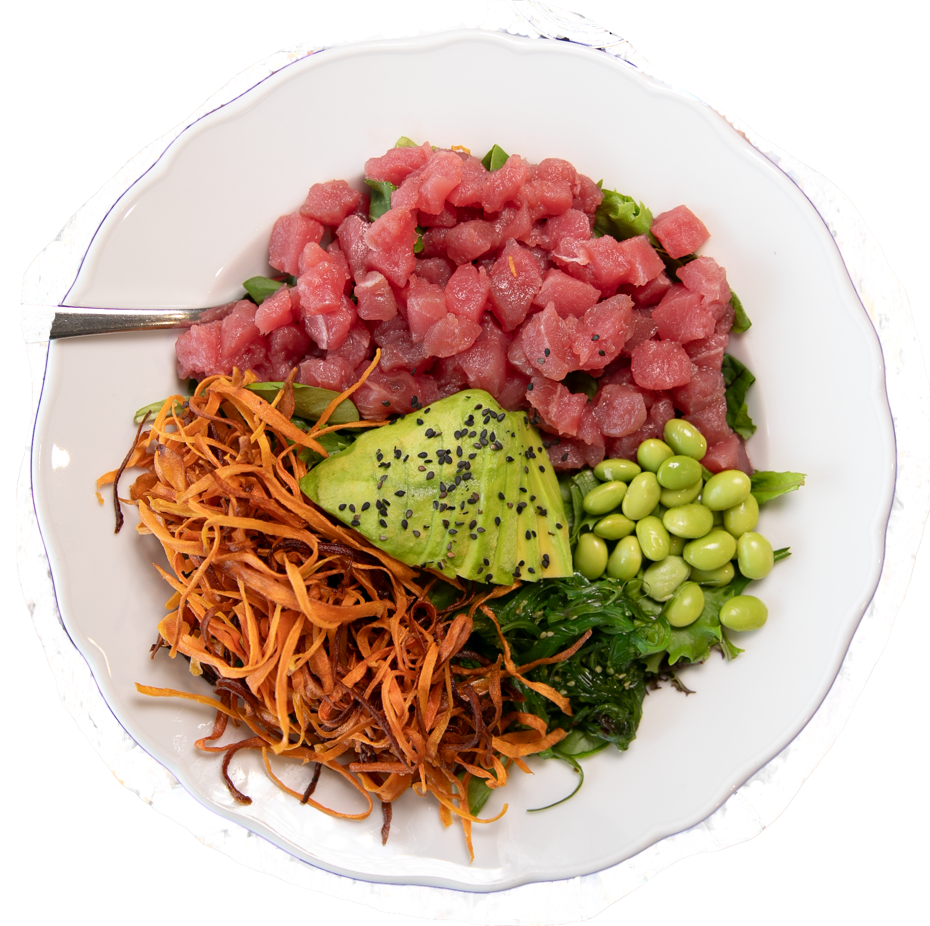 Ahi tuna fresco, edamame, seaweed, baby mix, aguacate, semillas de ajonjolí negro, zanahoria y vinagreta de soya y jengibre. / Fresh ahi tuna, edamame, seaweed, baby mix, avocado, black sesame seeds, carrot and ginger and soy vinaigrette.