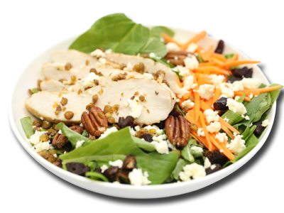 Rúgula, pechuga de pollo glaseada con miel orgánica y jengibre, quinua crocante, queso feta, tomaticos cherry y aceitunas negras. / Chicken breast glassed with organic honey and ginger, arugula, crunchy quinoa, feta, tomatoes, avocado and black olives.